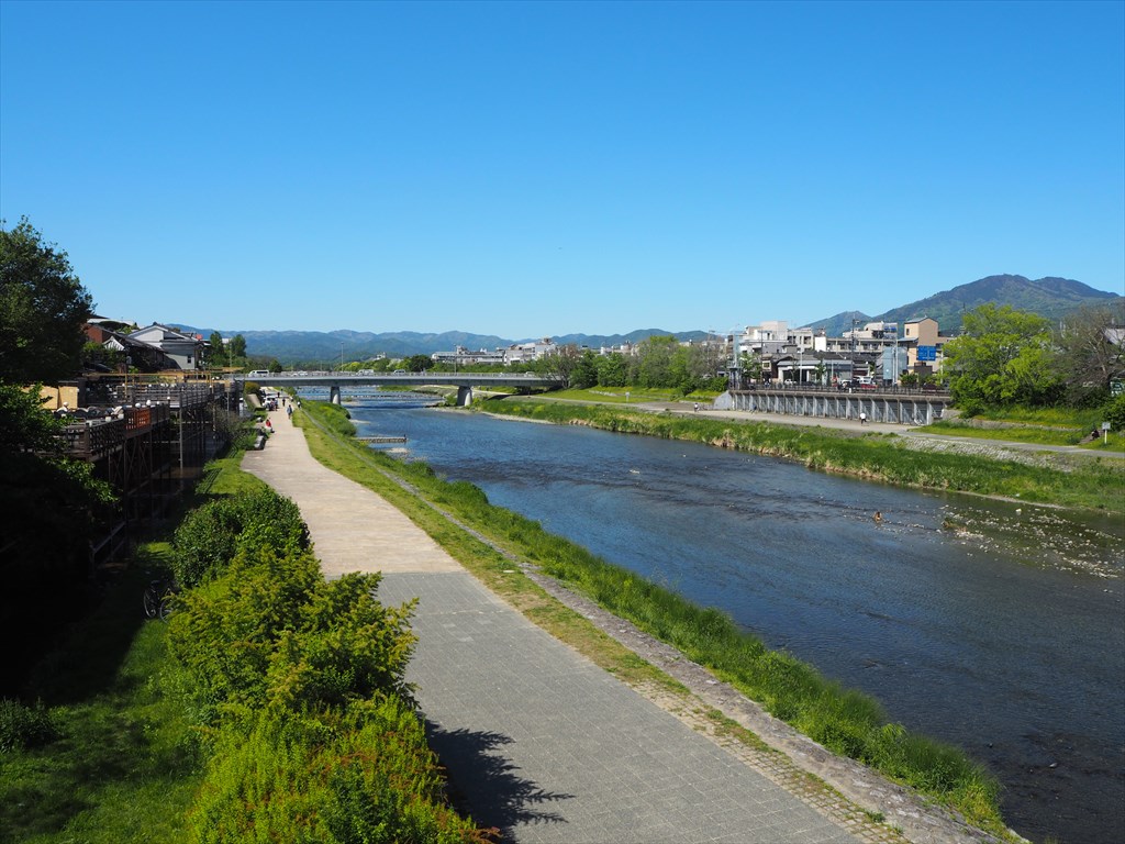 市民憩いの場としても親しまれている鴨川。5月からは昼の納涼床(皐月の床)が始まっており、6月には夜の本床も始まってきます。四条界隈は週末ともなればカップルを中心に川沿いに座る人たちが数珠繋ぎとなっています。橋の上からの景色は、場所によって変化をするため、自転車などで通りかかる際には、足をとめてみるのもおすすめです。
