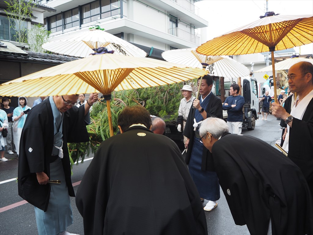 松取り式祇園祭は17日に前祭(さきまつり)の山鉾巡行と神幸祭が終わり、3基の神輿が御旅所に鎮座しています。お祭りは後半の後祭(あとまつり)に入り、北観音山・南観音山の山建て、大船鉾の鉾建てが始まっています。北観音山・南観音山の松は鳴滝の洪水家から届けられ、どちらが先に選ぶかは松取り式でくじを引いて決められます。今年は北観音山が先に松を選ぶことになりました。20日は曳初めがあり、21日からは宵山です。まだまだ祇園祭は楽しめます。