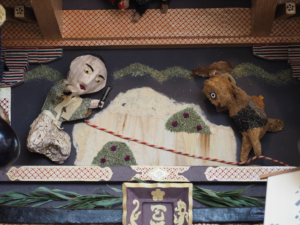 ずいき神輿の装飾には、毎年その時のタイムリーな題材が取り入れられています。今年の題材には大河ドラマの「いだてん」や今年ワールドカップが行われているラグビーの「トライ」、昔話では「ぶんぶく茶釜」と「鶴の恩返し」、「ライオンキング」や「ハリネズミ」、「鳥獣人物戯画」もかわいらしかったです。それぞれ多彩な材料を見事なアイデアで使用して形作られており、感嘆するばかり。
