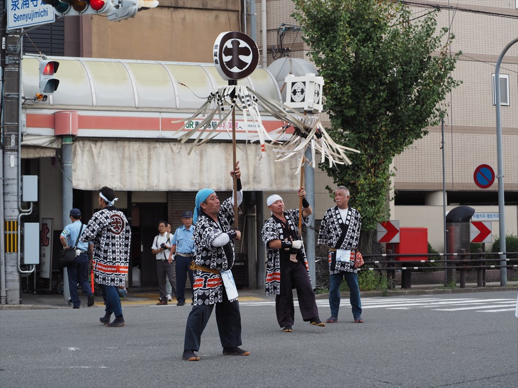 午後から神社を出発した神幸列は泉涌寺へと進みますが、今年は女神輿の台車が壊れたそうで、坂道も担いで登っていきました。暑い日でしたが関係者の皆様は本当にお疲れ様でした。神輿は泉涌寺の境内に入り仏殿の前に鎮座すると、僧侶による読経が行われました。さらに、太鼓や纏(まとい)の奉納も行われ、神輿の担ぎ手や僧侶も見守りました。泉涌寺は皇室ゆかりの由緒あるお寺ですが、近年こうした行事も行われています。瀧尾神社の交流の深さも感じる神幸祭。機会がありましたら、ぜひ現地でご覧になってみてください。