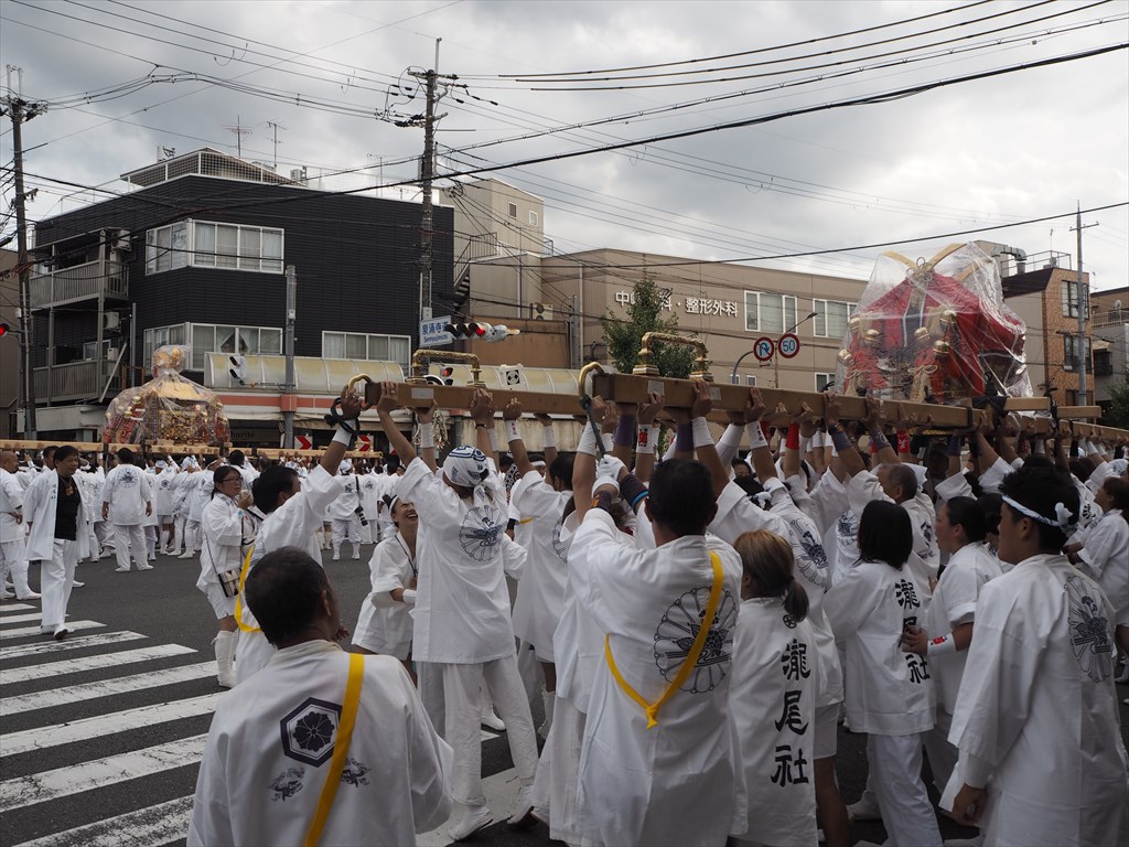 さて、瀧尾神社の神幸祭が今年は9月30日に行われました。現在の宮司さんの交流範囲が広く、各方面からの奉納行事があるのが特徴。その出し物は年によって変わることがあります。例年であれば、京都ではなかなか見られない中国の伝統芸能の「龍舞」が名物でしたが、今年は奉納がなく、剣鉾も雨の予報とあって出ませんでした。そのかわり立命館大学の学生による太鼓の奉納や、江戸の火消しが手にしたことで知られる「纏持ち(まといもち)」が参加して、神幸列に華を添えています。神輿は男性が担ぐ神輿だけでなく、女神輿があるのも珍しいです。
