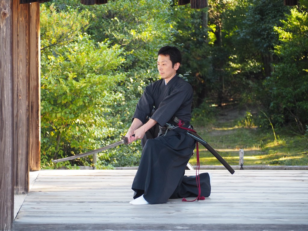 狂言に続いては、京都山内派居合抜刀術の奉納が行われました。こちらは真剣な表情で剣を振る様子が印象的。訪れていた方々から拍手が送られていました。また、裏千家の岡本宗琴社中によるお抹茶の無料接待もありました。大変ありがたいことです。来られているのは地元の方が多く、毎年楽しみにされている方もおられる行事だと感じました。機会がありましたら、訪れてみてください。