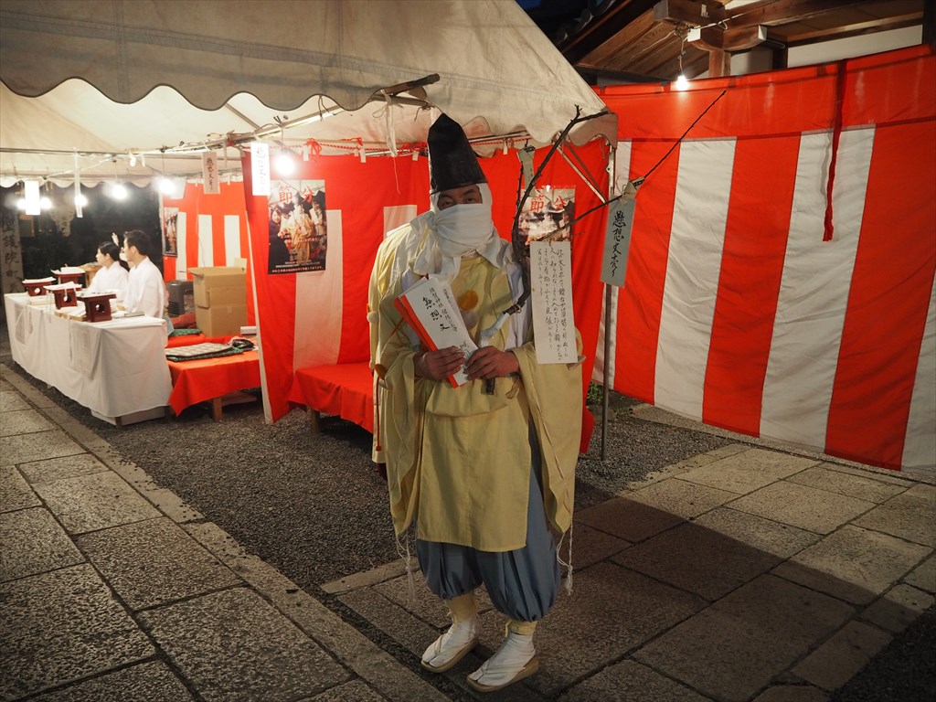 しかし貧乏公家にも家柄やプライドはある。ということで、烏帽子・水干で公家の装束をしながらも、顔を人に見せないように覆面姿をしています。なんだか涙ぐましいですね。肩にかけているのは梅の枝。昔は梅の枝に文を付けて売り歩いていたからだとか。梅の枝で新春の風情をかもしだすとは、なんともお公家さんらしい。今もその名残で、ちゃんと持っている枝には文が結びつけられています。懸想文は今年から1500円となりました。書かれている文章は毎年変わり、宛名の繋がりを毎年見るのも興味深いです。