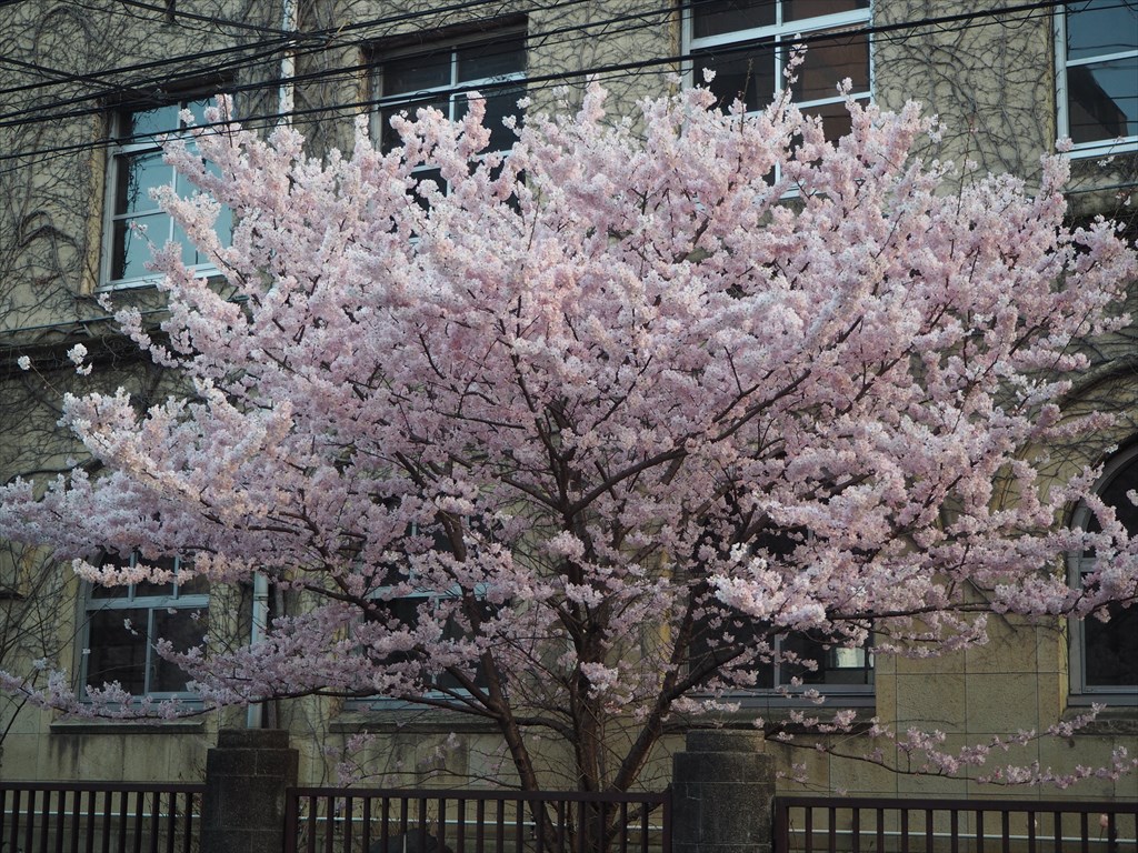 高辻通に面した「旧成徳中学校」の「春めき桜」が見ごろになっています。