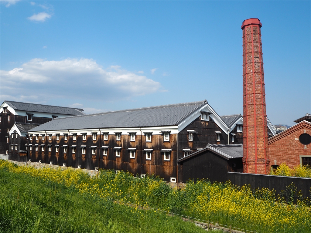 伏見にある松本酒造横の新高瀬川沿い土手には綺麗な菜の花が咲き、酒造の煙突など印象的な光景を彩っています。以前には、NHKの朝のドラマ「カーネーション」でも使われた伏見の春を代表する景色のひとつです。