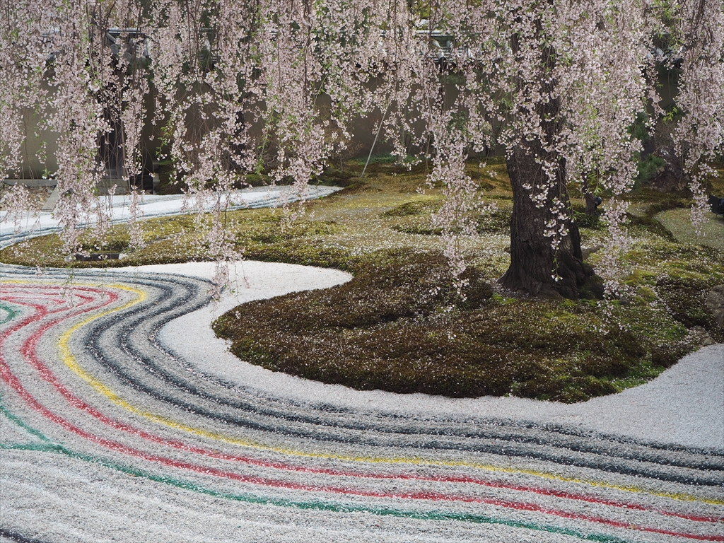高台寺今回も高台寺専属庭師である北山安夫氏の監修で、「乱舞」というテーマでした。勅使門の前には故加山又造が描いた「おぼろ」というタイトルの、しだれ桜と満月の絵が特注の陶板画で配されました。砂紋は赤、黄色、緑といったカラフルな線で彩られ、なかなかインパクトがありました。今回の写真は過去のもので、桜はすでに葉桜になっていると思われます。