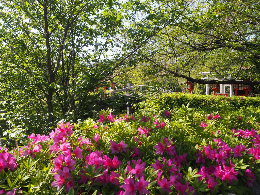 さて、六孫王神社の境内は計3回も鉄道によって浸食されています。明治時代に2回。2回目の東海道線の建設に伴って、すぐ北にあった源実朝ゆかりの遍照心院(へんじょうしんいん)と呼ぶお寺も移転してしまいました。現在は大通寺として九条大宮の南にあります。すぐわきを新幹線が通る境内は、4月には八重桜や藤、ツツジが綺麗に咲きます。先日、所用で近くに行った際に参拝させていただきました。
