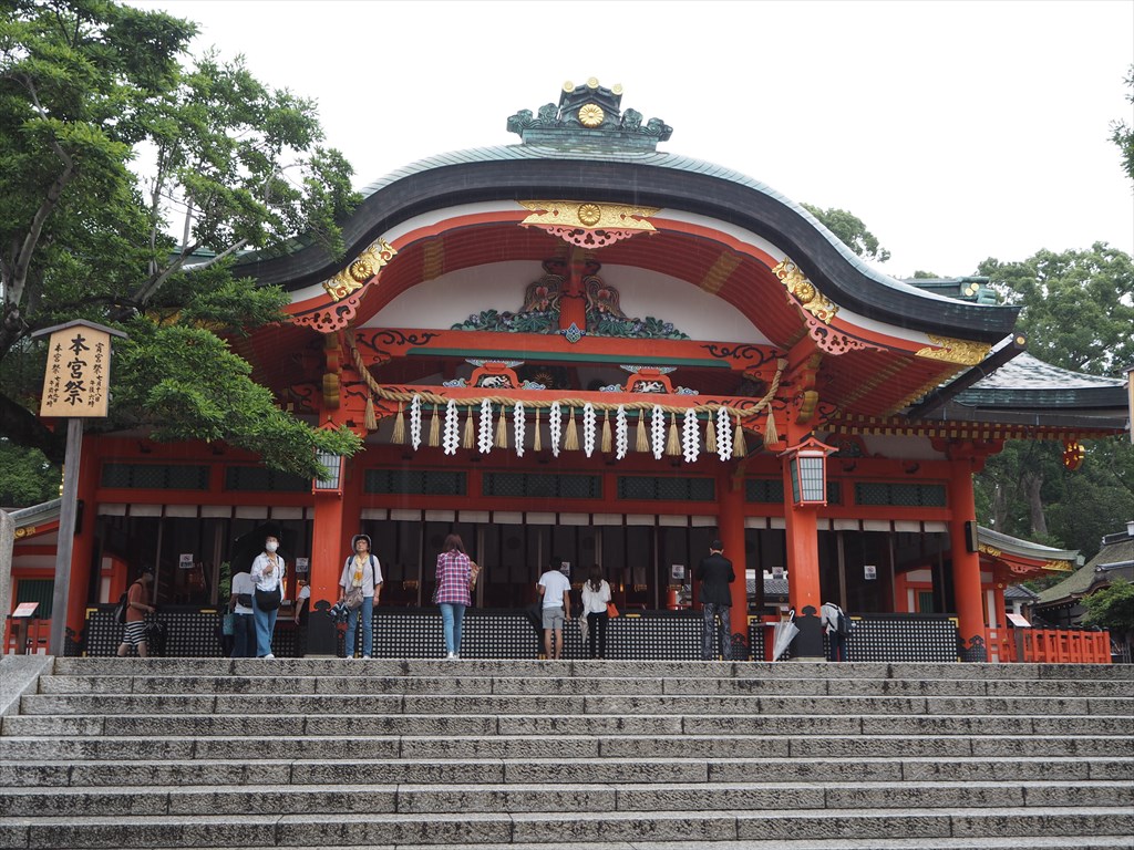 入り口の楼門は豊臣秀吉が寄進したとされる立派な門ですが、現在は茅の輪が登場しています。茅の輪は疫病を広める牛頭天王(武塔天神)が、旅先で一夜の宿を求めた際に快く泊めてもてなした蘇民将来の故事から来ています。牛頭天王は村に疫病を広めますが、蘇民将来の子孫は腰に茅の輪を巻けば疫病から逃れられると告げたとされ、現在は茅の輪や祇園祭の粽といった形で伝わります。これから6月末にかけて各地で茅の輪くぐりが行われますので、無病息災を祈願していきたいと思います。