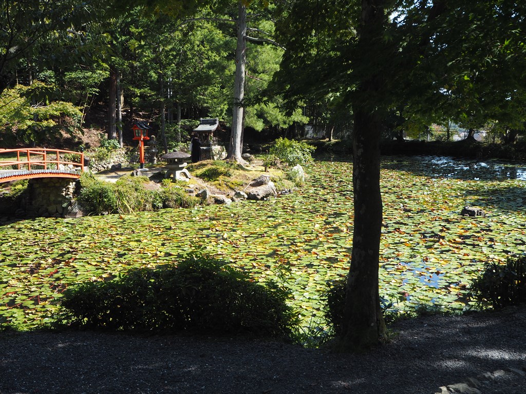 大原野神社 瀬和井の清水鯉沢池には赤いアーチ状の橋がかかり、どことなくモネの絵画「睡蓮」に似た風景。境内は静かで、参道にも時間帯によってはあまり人は見かけません。まだまだ緑が綺麗で、一直線の参道はキラキラと輝いて、和歌にも詠まれた瀬和井(せがい)の清水にも光が差していました。