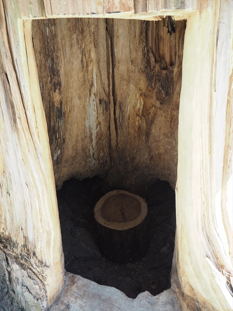 大原野神社なお、境内は2018年の台風で被害が出ており、寄付も募られています。先日訪れると、その台風で折れてしまった樹齢500年(450年とも)の太いモミの木の、残っていた根元の部分に屋根が掛けられて中が空洞として削られ、その空洞には入れるようになっていました。内部には椅子も置かれています。入り口は狭いですが「木の中に入る」という、なかなかできない体験ができますので、神社に行かれた際にはぜひご覧下さい。