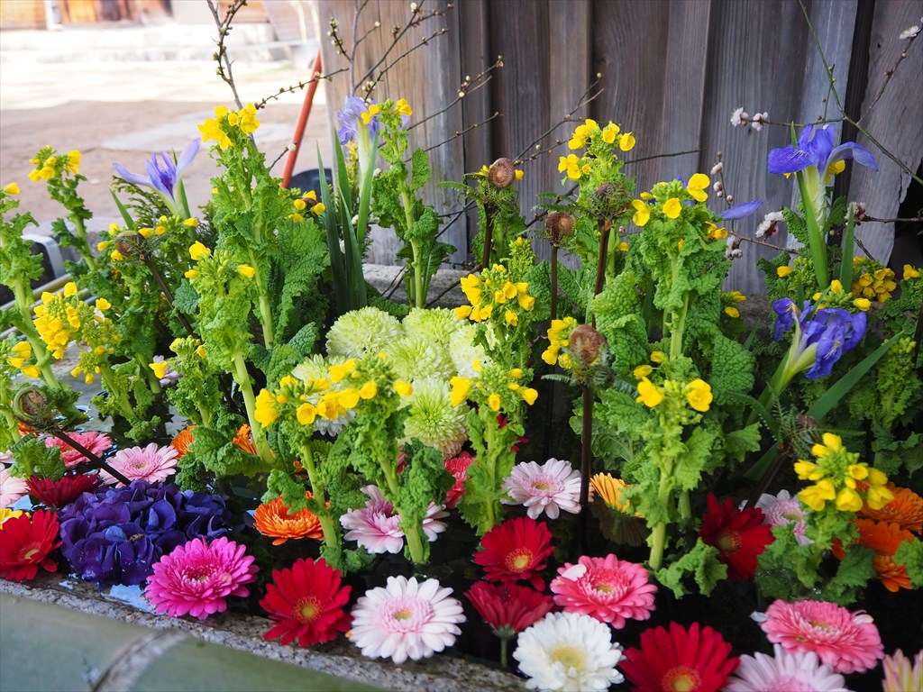 また、昨年来、まめに変えられている楼門裏の花手水。春の息吹を感じるような伸びゆく菜の花などが印象的でした。毎回季節を感じる内容でこれからも楽しみです。