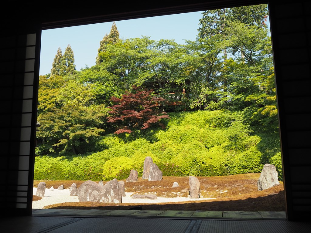 光明院の庭園の魅力は、室内から額縁に入った絵画のように眺めることができること。自分の好みの風景を切り取って静かに座して心行くまで眺めることができます。丸窓もあり趣ある風景を楽しめます。
