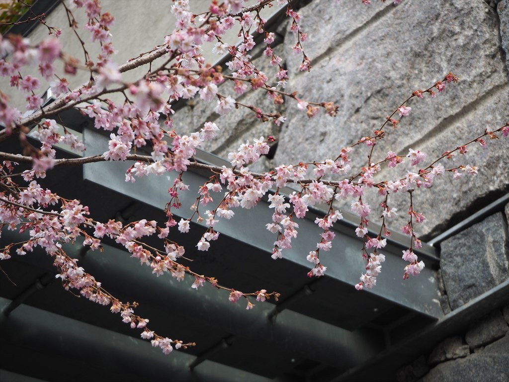 御池桜は、以前あった案内掲示によれば「不断桜」という種類で、例年11月から4月頃にかけて花を咲かせます。11月に開花をしてからゆっくりと花は増え、本数に勝る春の桜たちが現れるまでの冬の間中、チラホラと咲き続けて、春には満開を迎えます。桜が植えられたのは、2006年に京都御池創生館が出来た時だそう。柳池中学校の跡地を利用して作られた、中学校と福祉施設・商業施設を複合した建物は、京都御池創生館と呼ばれています。