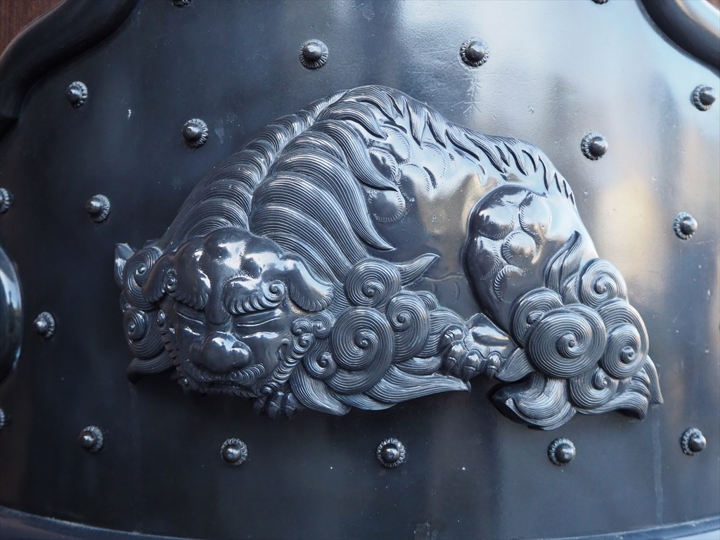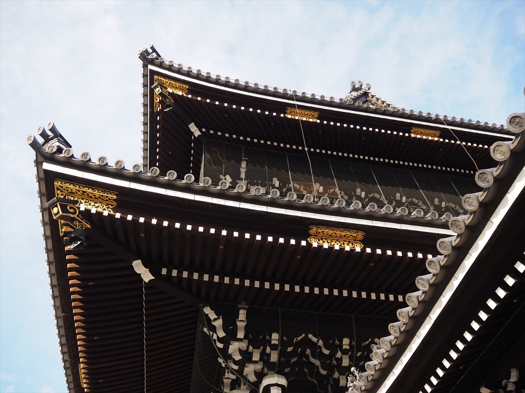 明治44(1911)年に建立された御影堂門(ごえいどうもん)は高さが約27m(26.897m)で、東大寺や知恩院の門を上回り国内最大です(文化財に指定・登録された木造山門に限る)。近年修復を終えて美しい外観を見せ、柱の根元が傷まないように巻かれた柱根巻には合計32体の獅子がデザインされていますが、正面向かって左端の柱の金具には眠り獅子がいて愛らしいです。