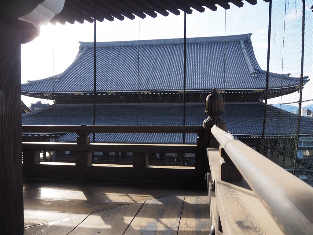 内部は通常非公開ですが、現在「京の冬の旅」で3月18日まで特別公開中。門の上からの写真撮影もOKで、境内や東山の眺め、京都タワーもよく見えます。東本願寺の正式名称である「真宗本廟」の額も目の前で見られ、内部の仏様にも拝せます。ぜひ、天気の良い日に上ってみて下さい。