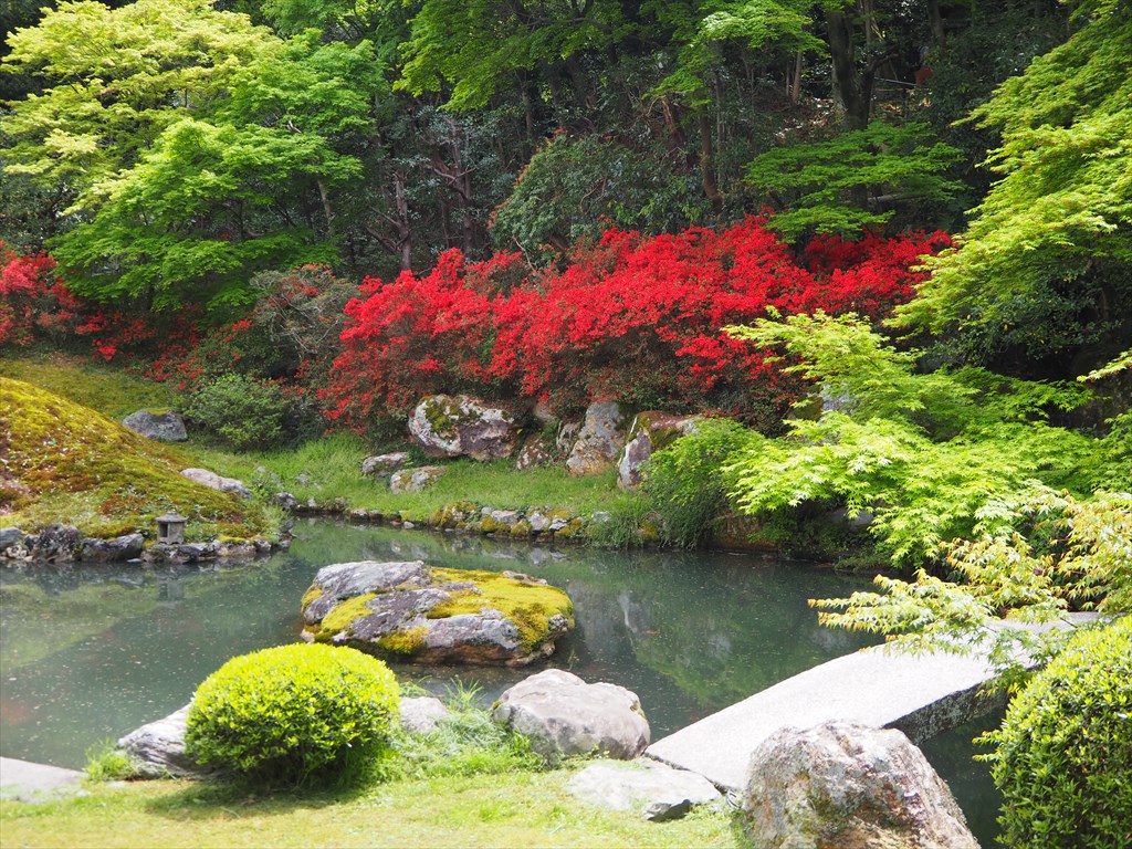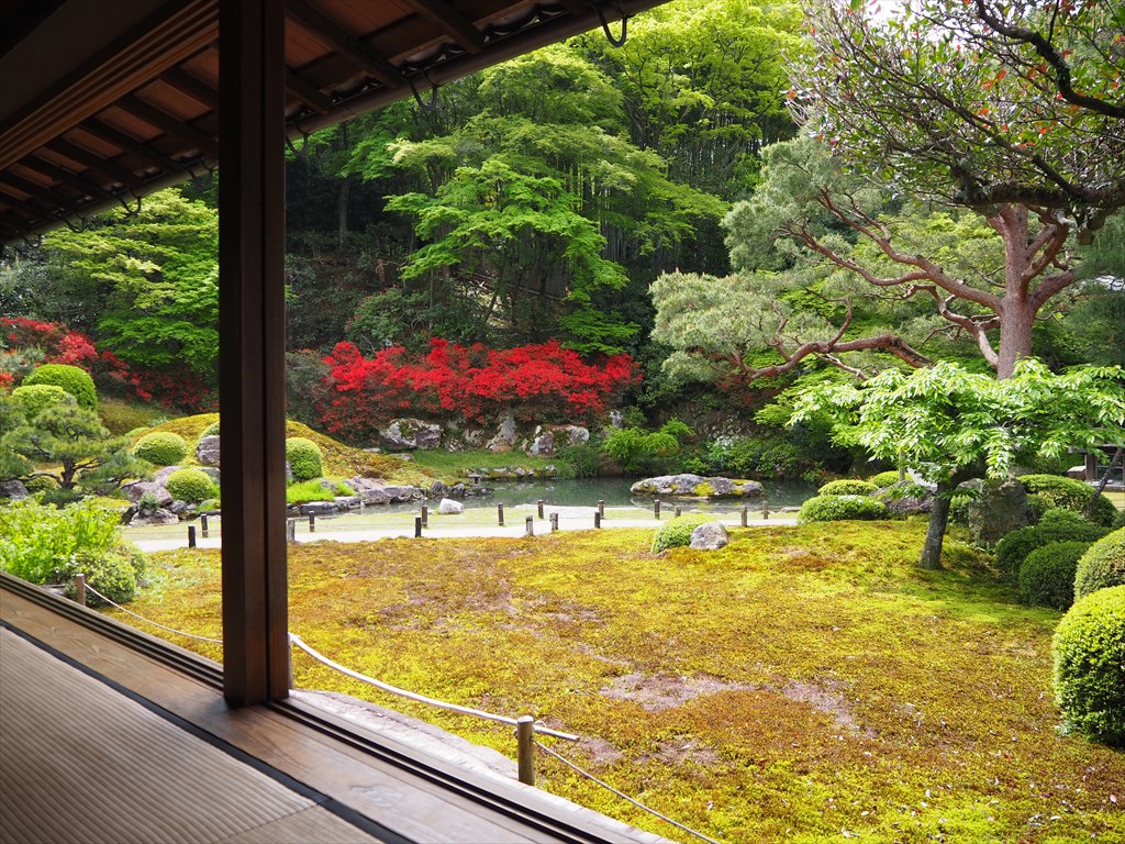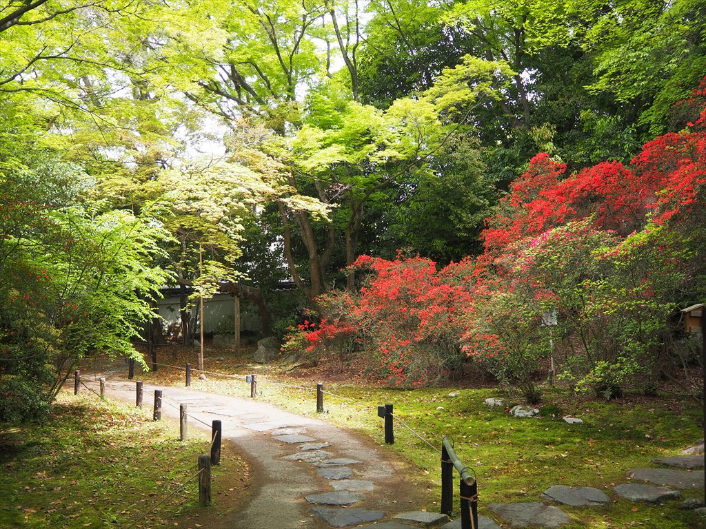 青蓮院の境内は、キリシマツツジが咲いて新緑の中に赤い色彩が加わる光景が見事でした。