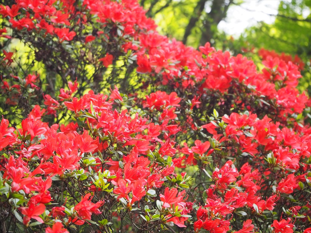 一方、お庭を散策すれば、現在は「霧島の庭」の由来となったキリシマツツジが咲き、深い赤色の花を咲かせています。柔らかい楓の新緑に包まれた散策路を歩いていると、突然目の前に現れる深紅のツツジ。この赤色の見事さは他の追随を許さないほど赤の中の赤色で、お庭の冠を飾るにふさわしい花です。週末にかけて見頃が続きそうです。
