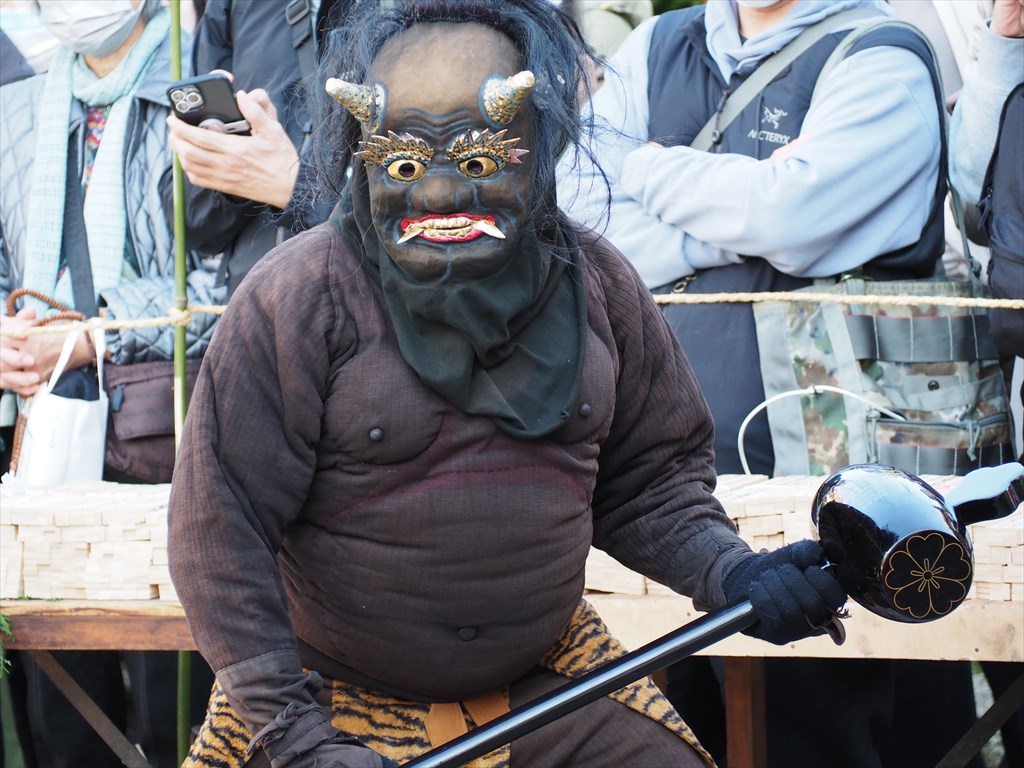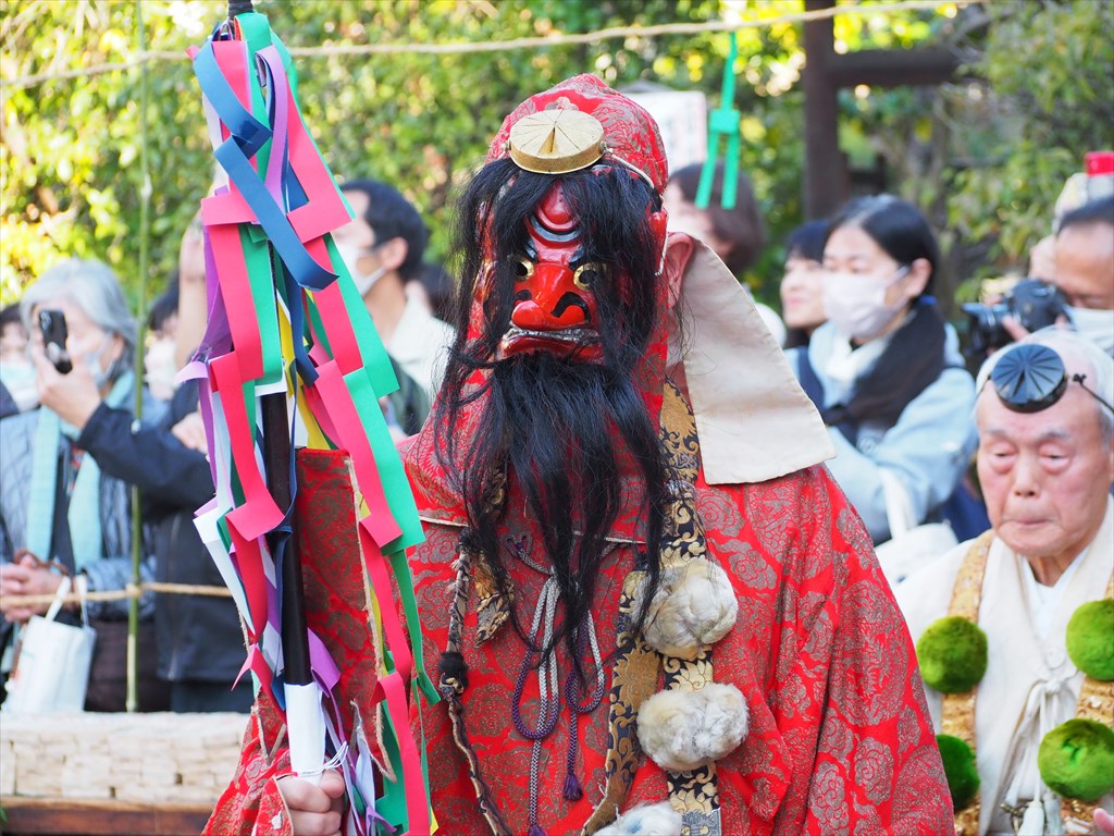 続いて、山伏問答が行われます。これは結界の中にいる山伏の元へ、外から別の山伏がやってくるという設定の問答で、修験道について尋ねられた外の山伏が丁寧に回答をしてその素養を認められ、結界の中へと入って行きました。