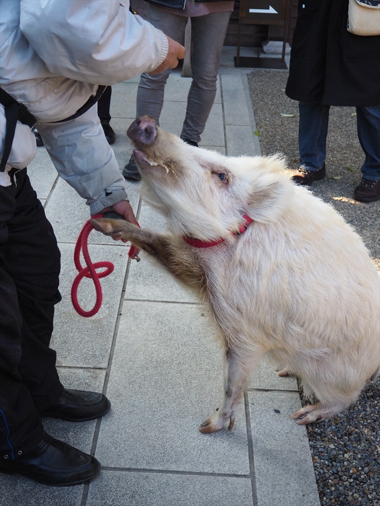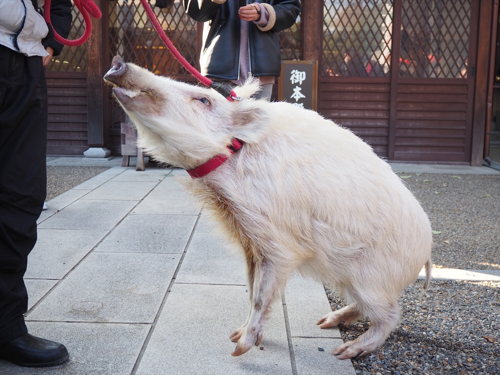 護王神社では、6日まで本物の猪(イノシシ)に出会えます。