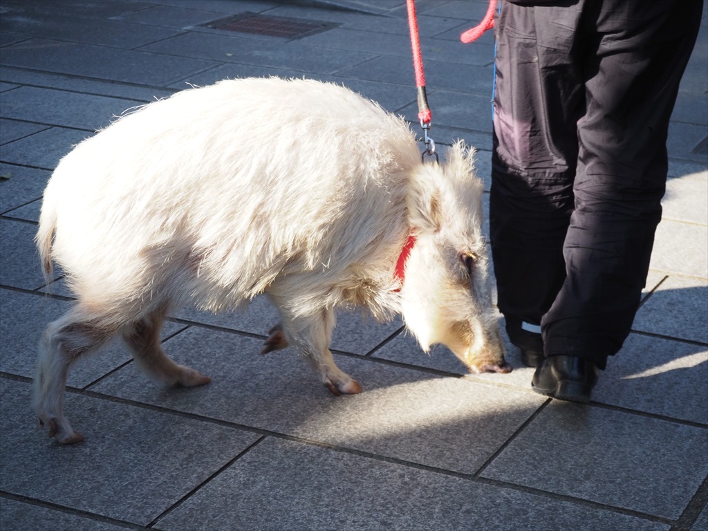 今年は元日~6日に本物の猪がやってきています。大変珍しい白い猪の花梨ちゃんで、幸運の白猪として人気です。同じく白い親から平成21(2009)年に生まれ、大分の宝八幡宮からやってきて普段は静岡で暮らしているそうです。毎年お正月に護王神社にやってきており、14歳の年齢は猪としては高齢だそうです。