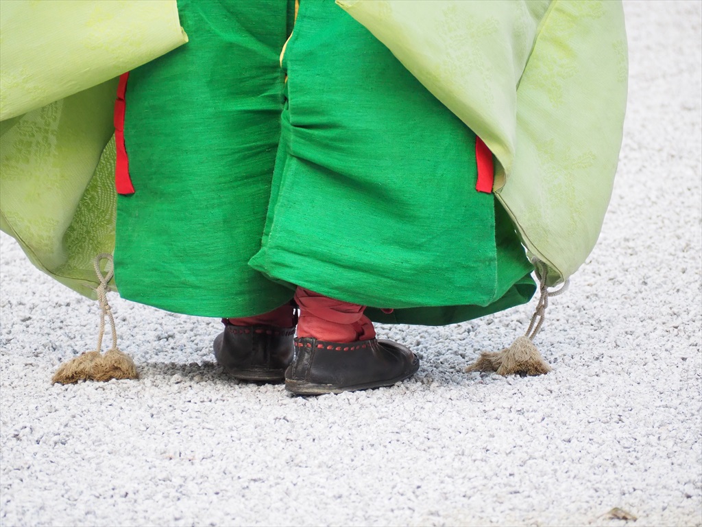 本殿前での神事を終えると、蹴鞠を行う場所(鞠庭:まりば)で「始まりの儀」が行われました。お祓いのため松の枝にくくられていた鞠を外す解鞠(ときまり)が行われます。これは野球などで言う始球式のようなものだそう。その後に、鞠を中央に置き、鞠を蹴る人が順番に入りますが、最初の方が一番位が高く、その時の日差しや天候を考慮した一番良い場所に立つことができるそうです。そして各々試し蹴りをして蹴鞠が始まります。