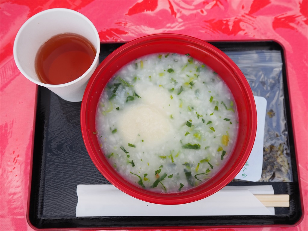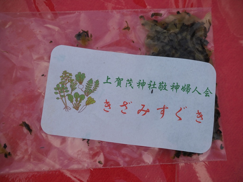 上賀茂神社の七草粥は500円でいただけ、ボリュームもたっぷり。お餅も入っており、しっかりお腹が満たされるお粥でしょう。上賀茂特産のすぐきのお漬物も添えられ、お粥と一緒に食するとちょうどよい塩加減となります。味が物足りない方のためにも食卓塩も用意されていますので、お好みでかけていただけます。機会がありましたら、ぜひ食してみてください。