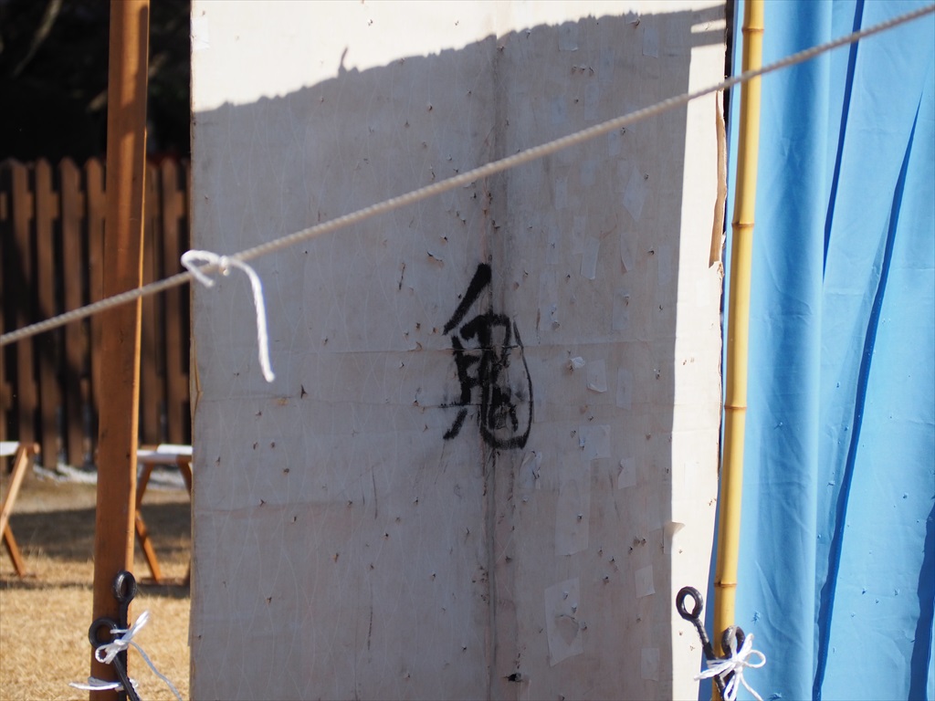 続いて、弓馬術礼法小笠原流・近畿菱友会(りょうゆうかい)の皆様により、2組に分かれて百手式(百々手式・ももてしき)が行われました。的は変えられ、裏には「鬼」の字も書かれていますが、こちらは逆さまになり、角の部分が無くなっています。鬼の字を逆さにするのは京都の行事では目にした記憶がなく、調べてみると関東の行事で行われている風習のようです。他のブログやニュース記事の記載では、逆さにするのは鬼の角を取り逆さ磔(はりつけ)にする意味があるとか、悪霊を退散させるためとか、古来からの風習でよくわからないなどの理由が出てきました。