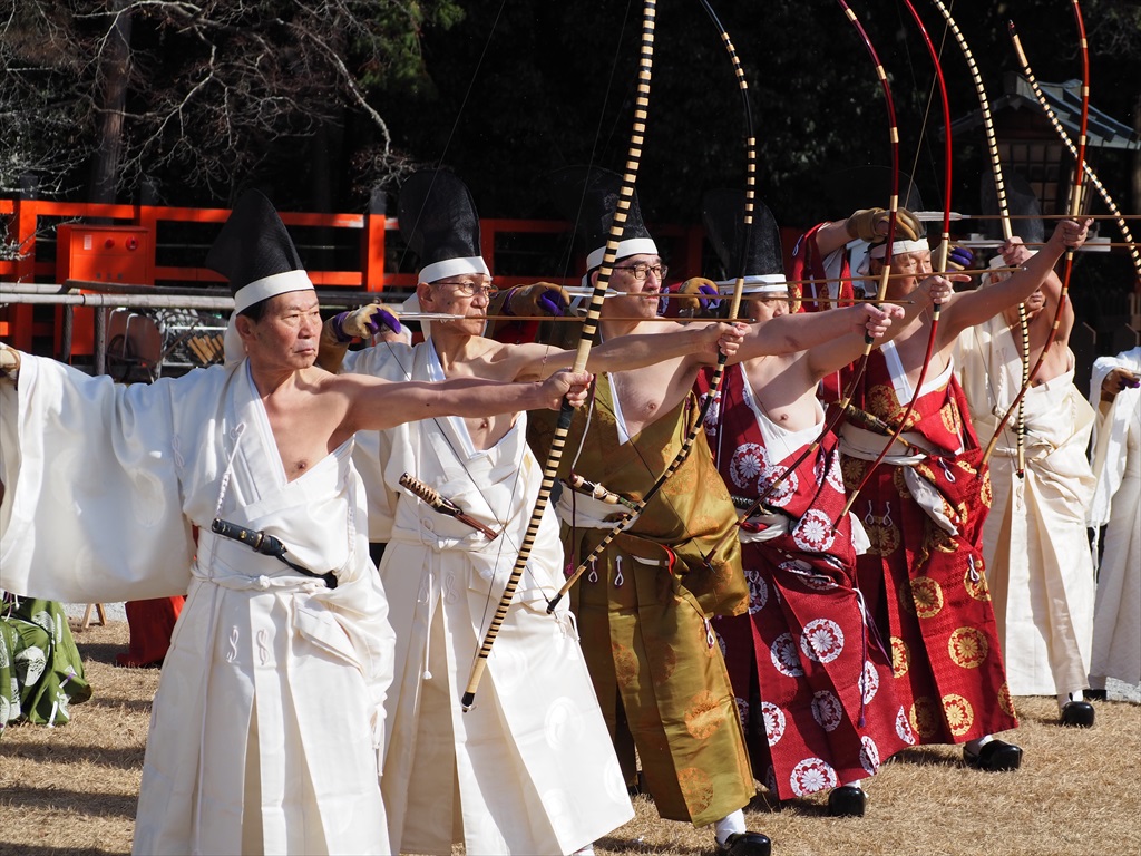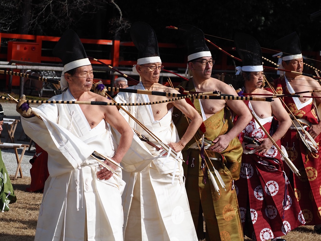 この「ひきめ」の由来は、鏑矢の音がヒキガエル(蟇蛙)の鳴き声に似ているからだとか、あるいは音を出すために鏑矢に開いている穴がヒキガエルの目に似ているからだともいわれています。この神事では、射る前に的に魔性のものを集める言葉を唱え、鏑矢を射て退散させます。続いて的を設置し、神職が丹塗りの矢でそれを射ます。的の裏には「鬼」の文字が書かれており、災いの象徴である「鬼」を的に射るのです。