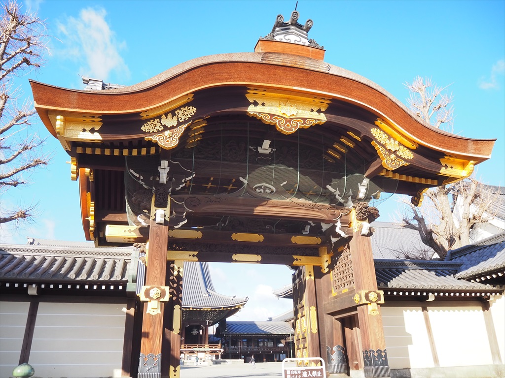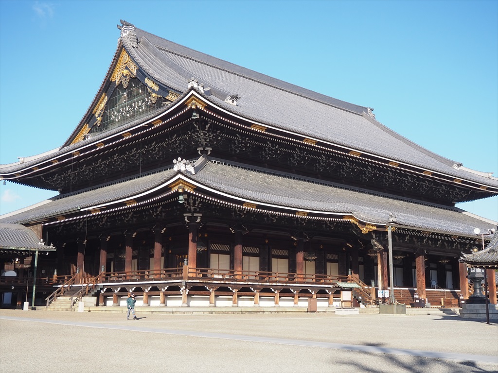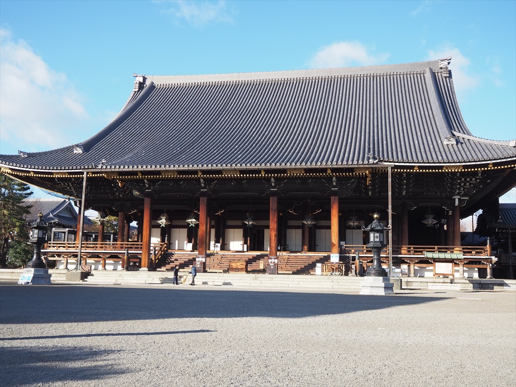 御影堂と阿弥陀堂の間には多くの女性信者が髪を断ち寄進した「毛綱」が展示され、再建時にはこの毛綱で用材の巨木を引きました。御影堂門は高さが約27mで、東大寺や知恩院の門を上回り、国内最大です(文化財に指定・登録された木造山門に限る)。寺内は西本願寺と同様に、御影堂と阿弥陀堂を自由に参拝することができ、京都駅にも近い立地から、以前は海外の方も多く訪れていました。巨大なお堂は青空にも映え、圧倒的な存在感を放っています。阿弥陀堂内は近年金箔が貼りなおされて、荘厳さが増しました。