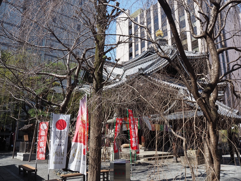 平安時代のはじめに嵯峨天皇が妃を求めて六角堂に祈願をすると、夢の中で「境内の柳の木のたもとに行くべし」とのお告げを受けました。天皇がその通りに訪れてみると、美しい女性が立っており天皇は妃に迎えたと伝わっています。いまでは本堂前の柳に境内で引いたおみくじを結ぶ際に2本の枝をくくって祈願する習わしになっています。境内はたくさんの鳩がおり、社務所では鳩にちなんだかわいらしい鳩みくじもあります。12日に訪れると柳が芽吹き始めていて、柔らかい緑が目に鮮やかでした。