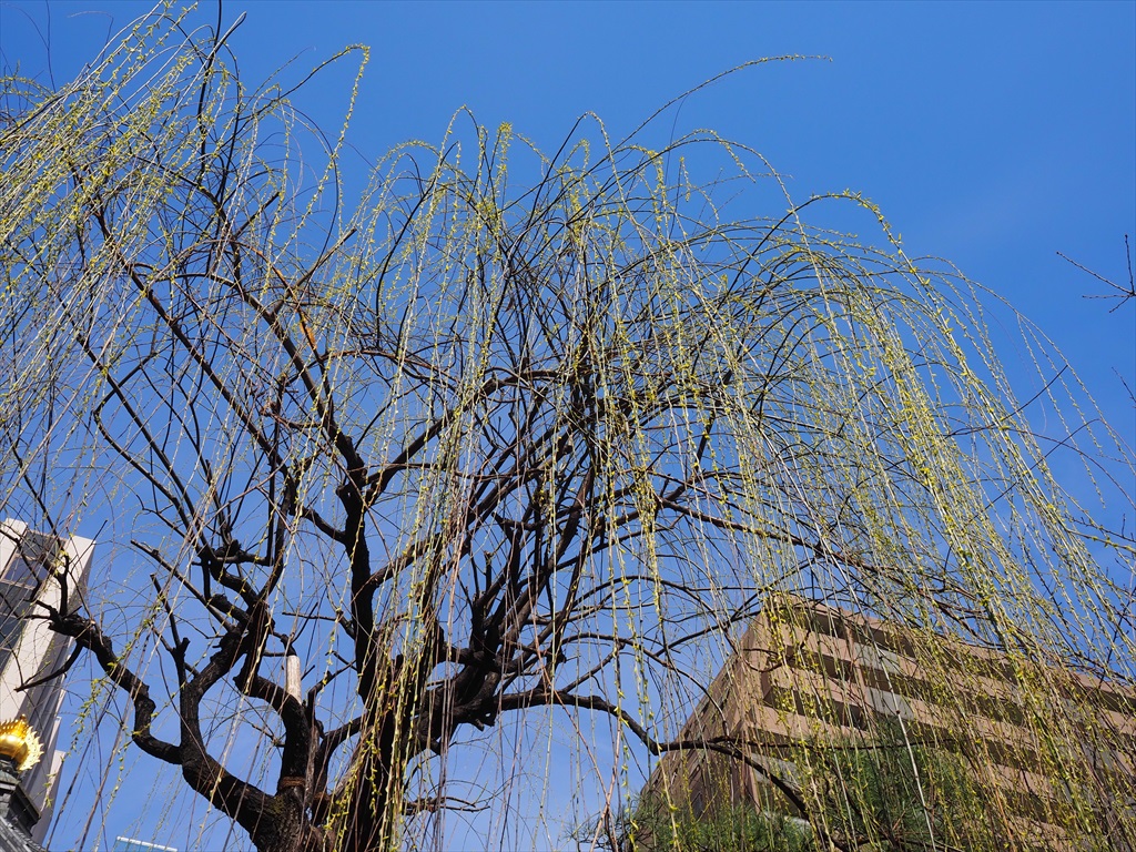 六角堂では、柳が芽吹いて目に鮮やかです。