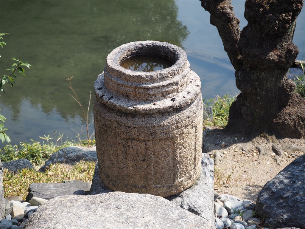 園地は平安初期の貴族・源融(みなもとのとおる)の邸宅・六条河原院の跡とされることもありますが、場所がずれており史実ではありません。ただ、六条河原院を偲んで塩釜の手水鉢が置かれていたり、造営中に発掘された石塔が源融の供養塔として建てられています。