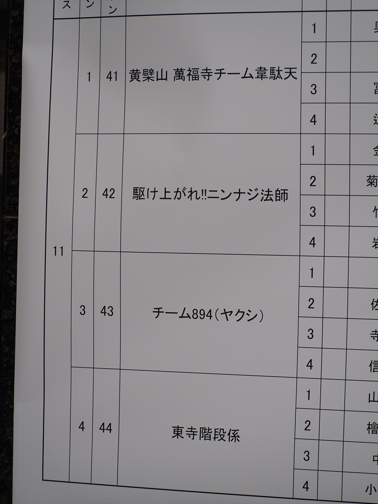 階段を上がるのは、1段づつでも2段3段づつでもよく、頂上には体の一部が入ればゴールと認定されるそうです。今年は72チーム・288人が参加して、4チームが1組となって一斉に走ります。雨の降る時間帯もあった中、元気よく階段を駆け上っていきました。話題となったのが、萬福寺(黄檗宗)、仁和寺(真言宗御室派)、延暦寺(天台宗)、東寺(真言宗東寺派)の僧侶らが同じ組で競争をしたことでしょう。結果は延暦寺の勝利でした。さすがに山の中にお寺があるからでしょうか。