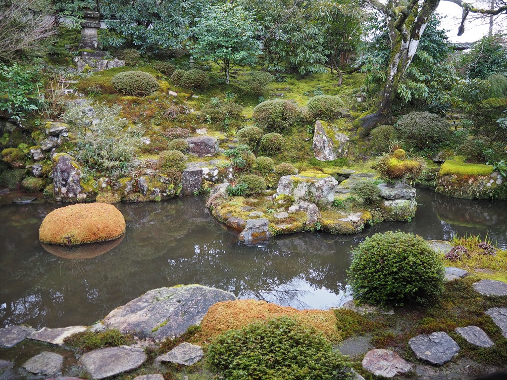 大原の実光院は、三千院から勝林院への途中にある勝林院の塔頭寺院で、三千院や宝泉院に比べると穴場な部類に入るお寺です。ゆっくりとお抹茶を頂きながら庭園の眺めを楽しめます。本尊は地蔵菩薩で、学僧が住み声明(しょうみょう)を伝承するために創建されました。庭は契心園と呼ばれ、律川の水を取り入れた池を主体としています。額縁状に望む光景は、心を癒してくれるでしょう。