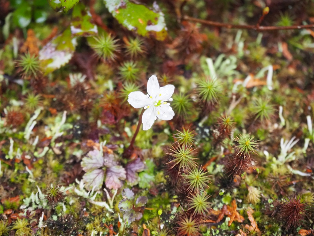 また、茶室に向かう路地の足下には苔の中にバイカオウレンが咲いていました。昨年のNHKの朝のドラマ「らんまん」の主人公のモデルとなった牧野富太郎が愛した花として注目されました。小さな白い可愛らしい花で、心を癒やしてくれました。
