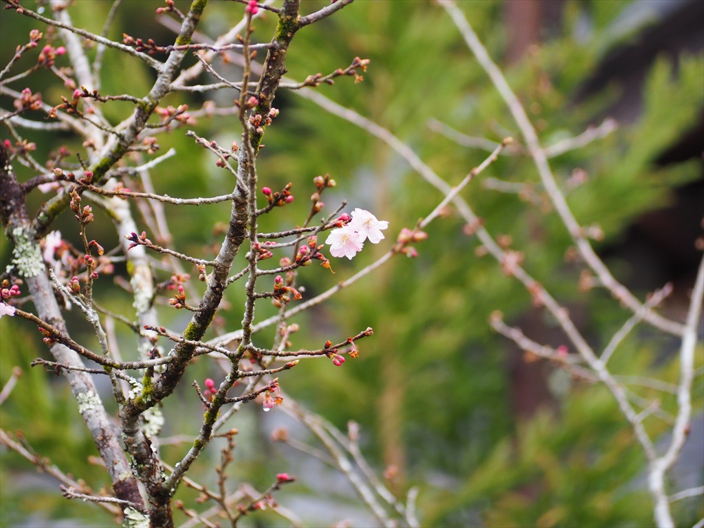 実光院にはもうひとつ庭園があり、歩いて散策ができます。そちらには晩秋から春にかけてチラホラと花を咲かせる珍しい「不断桜」があることでも知られ、紅葉と桜を同時に目にすることもできる珍しい場所です。26日に訪れると花の数が少なかったですが、これから暖かくなると花の数も増えてくるでしょう。