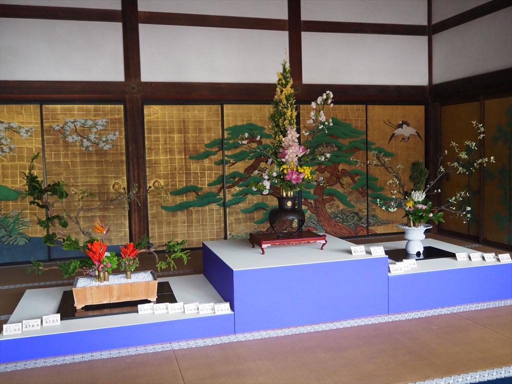 大覚寺はいけばなの嵯峨御流(さがごりゅう)ゆかりの寺として知られ、毎年春に華道祭が行われています。嵯峨御流は、嵯峨天皇が大沢池にある菊が島の菊を手折り、殿上の花瓶に挿されたのが始まりとされており、嵯峨天皇の離宮がのちに寺に改められたのが大覚寺です。華道祭では、大覚寺の建物内に生け花が展示されてより一層華やかになります。