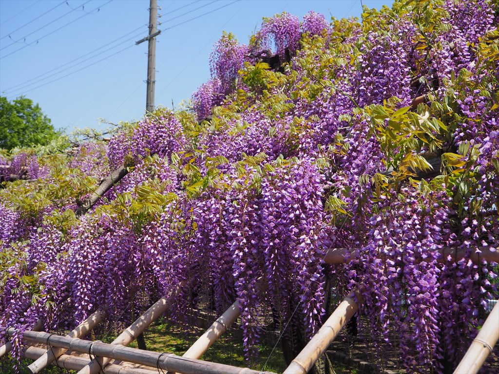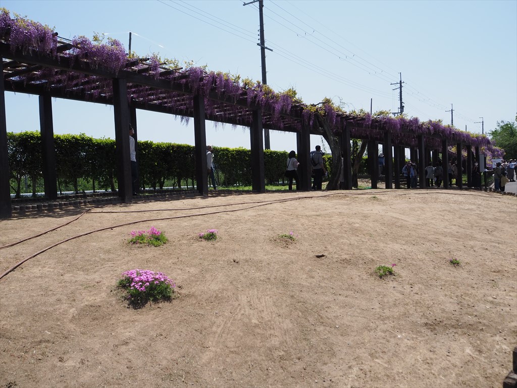 藤棚は120mもの長さがあり、ピーク前ではありますが見頃の時期と重なり、大変見事な光景でした。藤のトンネルを多くの人が笑顔で通り抜けていきます。なお、紫の藤は何十本もあるように見えますが、1本の木が長く伸びるため、全体の本数は意外と少なく感じます。かつては芝桜が彩りを加えていましたが、今はほとんどなくなっていました。以前から年々減りつつありましたので、致し方ないでしょうか。
