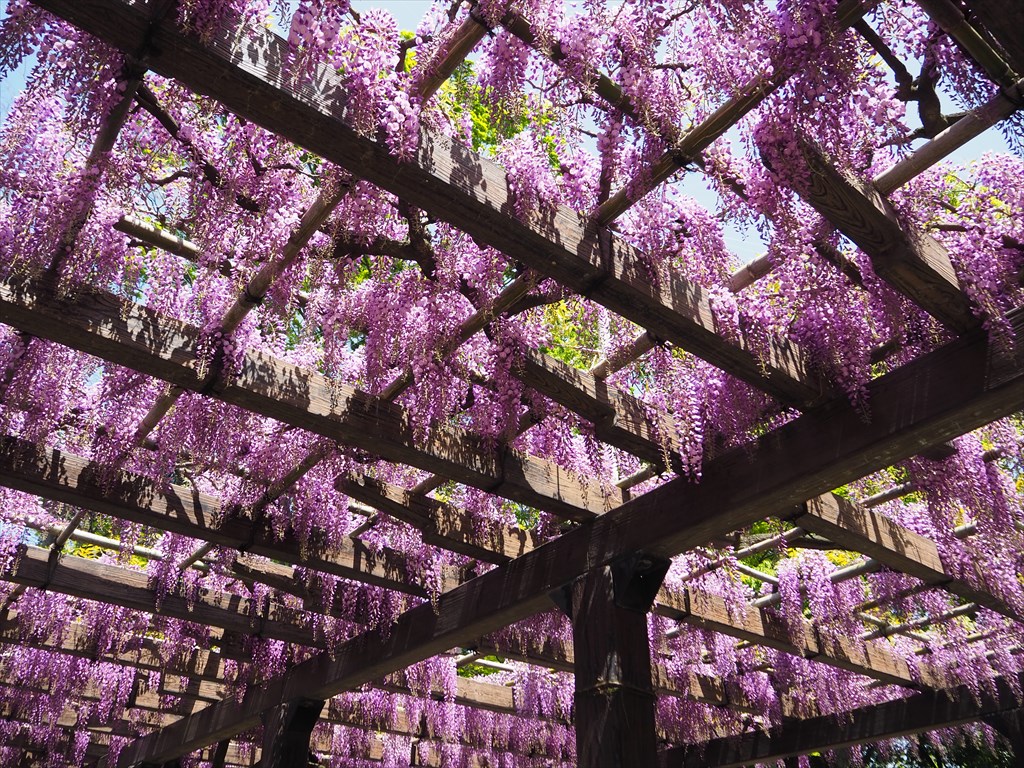 藤のトンネルを過ぎて奥に進むと、もうひとつ美しい一角があります。そちらは藤が空を覆い尽くして、ベンチも置かれた癒しスポットとなっています。ここまで見事な藤棚は京都近郊では私は他に知りません。素晴らしい光景に多くの方が笑顔になっていました。