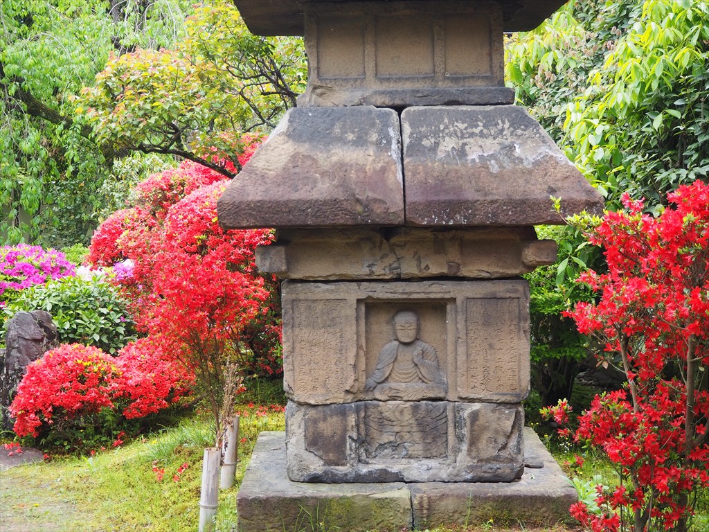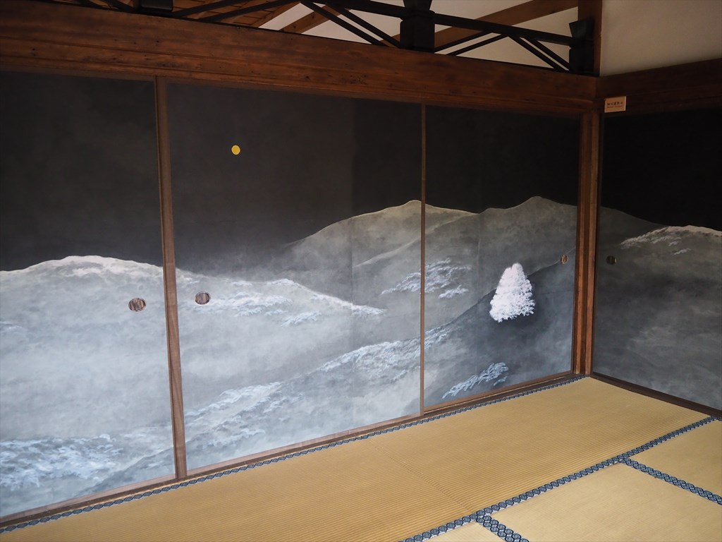 本堂(方丈)には有楽斎の像も祀られています。また、部屋には細川護煕氏が絵を描いた襖がはまっています。春の公開と秋の公開とでは襖絵が変わり、この期間は春と夏の絵が公開。山並みの美しさが印象的です。春の今の時期は新緑に加えて、深紅のキリシマツツジが咲いて色彩のコントラストが見事。お早めに訪れてみてください。
