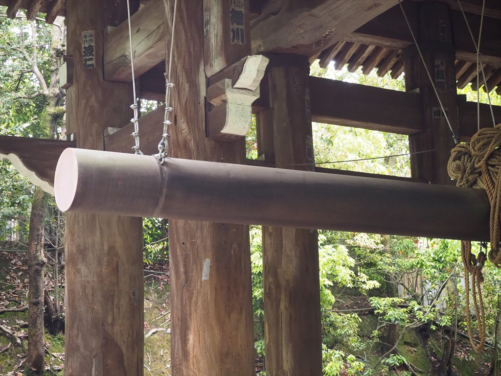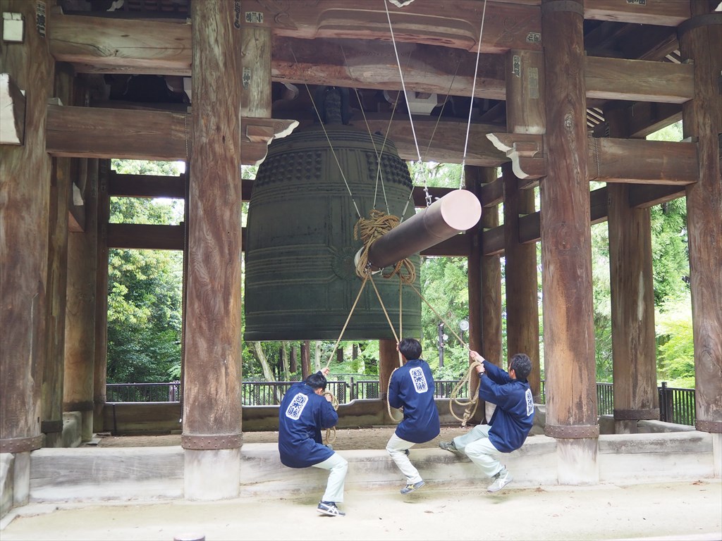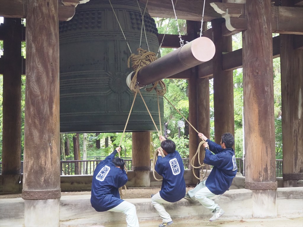 大晦日やその試し撞きでは、僧侶17人で手綱を持つ壮観な光景の中で撞かれますが、御忌の鐘は基本的には植木屋さん3名のみで撞かれます。お坊さんは御忌の期間は忙しいようです。撞木(しゅもく:鐘を打つ木)の重さは約400kgにもなるといわれますが、普通に撞く分には17人もの人数は必要ないよう。大晦日に鐘を撞く人数も時代によって少し変わっており、古い文献では15名となっているものもあります。現在は、逆さになって撞く1名をお釈迦様に、残りの16名を十六羅漢になぞらえて撞いておられます。
