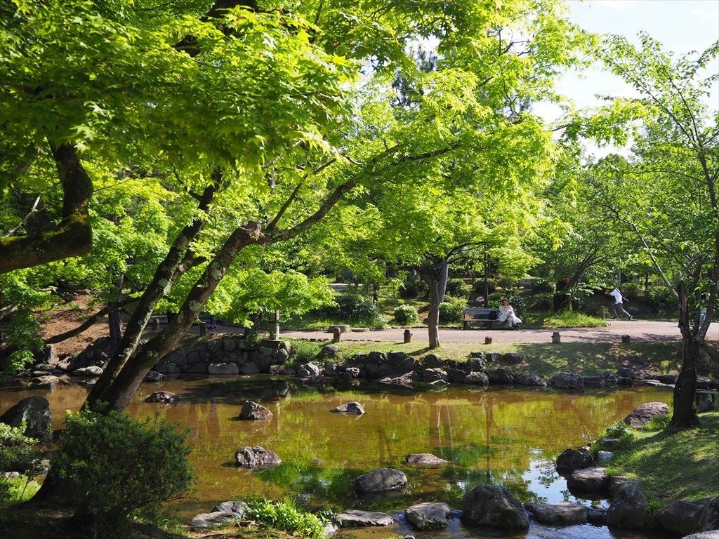 東山の円山公園は新緑が美しく、池にはカキツバタが綺麗に咲いていました。