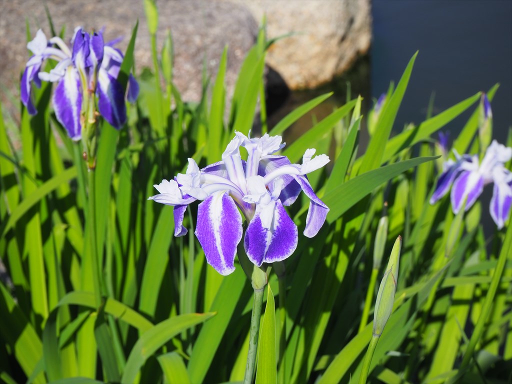 そんな公園の池に、カキツバタが咲いています。カキツバタは水辺を好み、花の付け根が白い(ないしクリーム色)という特徴がありますので、この花は花菖蒲ではなくカキツバタでしょう。花菖蒲の場合は花の付け根は黄色になり、アヤメの場合は水辺ではなく陸地に咲きます。