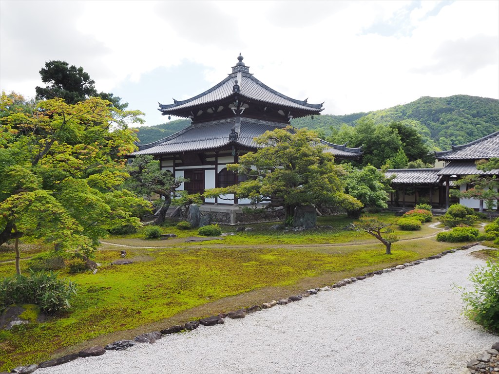 境内を拝観すると客殿の前から嵐山を借景とするお庭が望めます。縁側に座って心行くまで時を過ごしてみてください。建物では舎利殿が目を引きます。鎌倉幕府の3代将軍・源実朝が宋の国から手に入れた仏牙舎利(ぶつげしゃり)を安置するお堂。