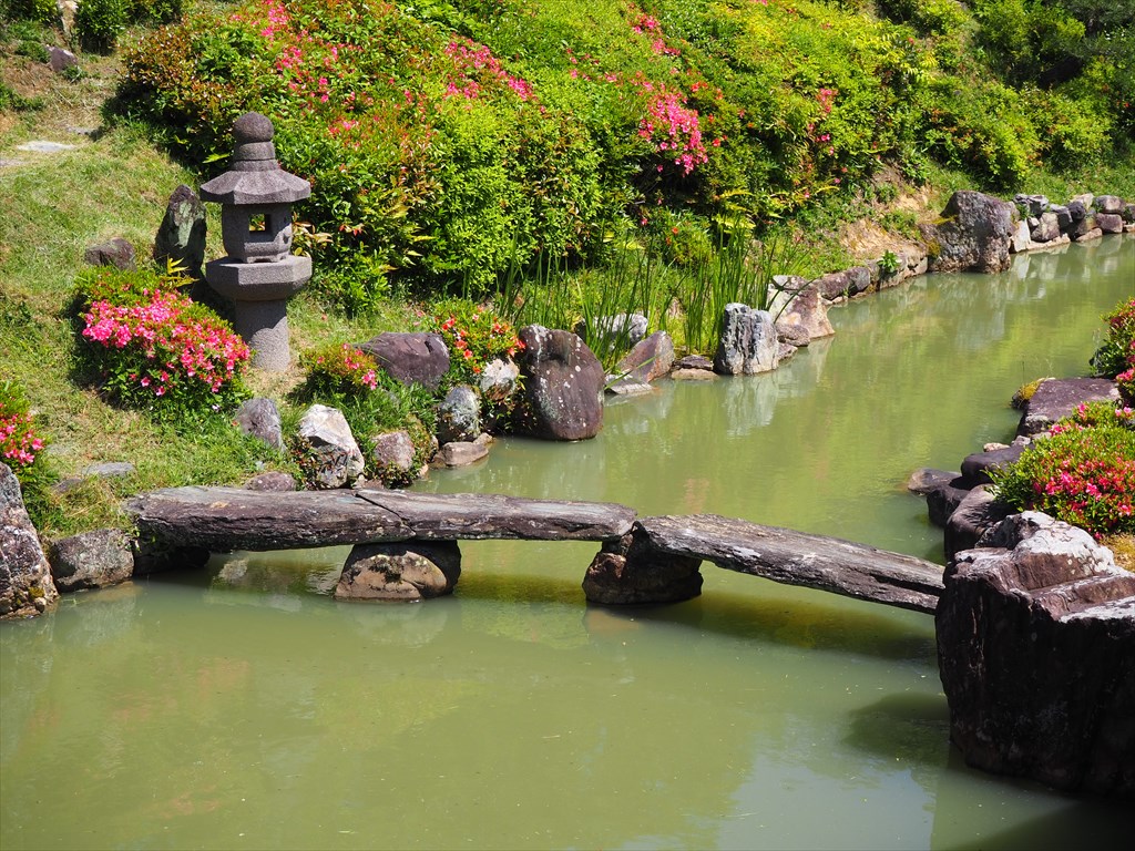 智積院は、豊臣秀吉が幼くして亡くなった鶴松を弔うために創建した祥雲禅寺の場所に移ってきたお寺です。名勝庭園はその秀吉時代に築かれたものを受け継ぎ、当時の庭の面影は、名勝庭園の南側に残されていると伝わります。北部分は江戸時代に修築されて現在に至っています。池の中に大きな築山があり、その上に石や刈り込みを配して深山の趣を造りだしています。この築山は中国の廬山(ろざん)を象り、今の時期は緑やサツキが彩っています。