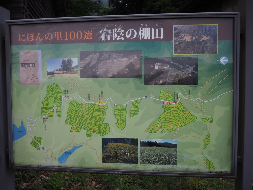越畑は「京都の信州」とも呼ばれているほど、山里の美しい景色が見られる場所です。特にカメラマンの間では「棚田」があることでも知られ、夏から秋にかけては棚田には蕎麦の花も咲きます。蕎麦は荒れ地に強く、まさにこうした山間地に向いている作物ですね。越畑は林業が主産業で耕地に乏しい場所であるために、斜面を少しでも活用するために棚田が発達しています。地図で見ると分かりにくいですが、航空写真で見ればその広がりは一目瞭然です。