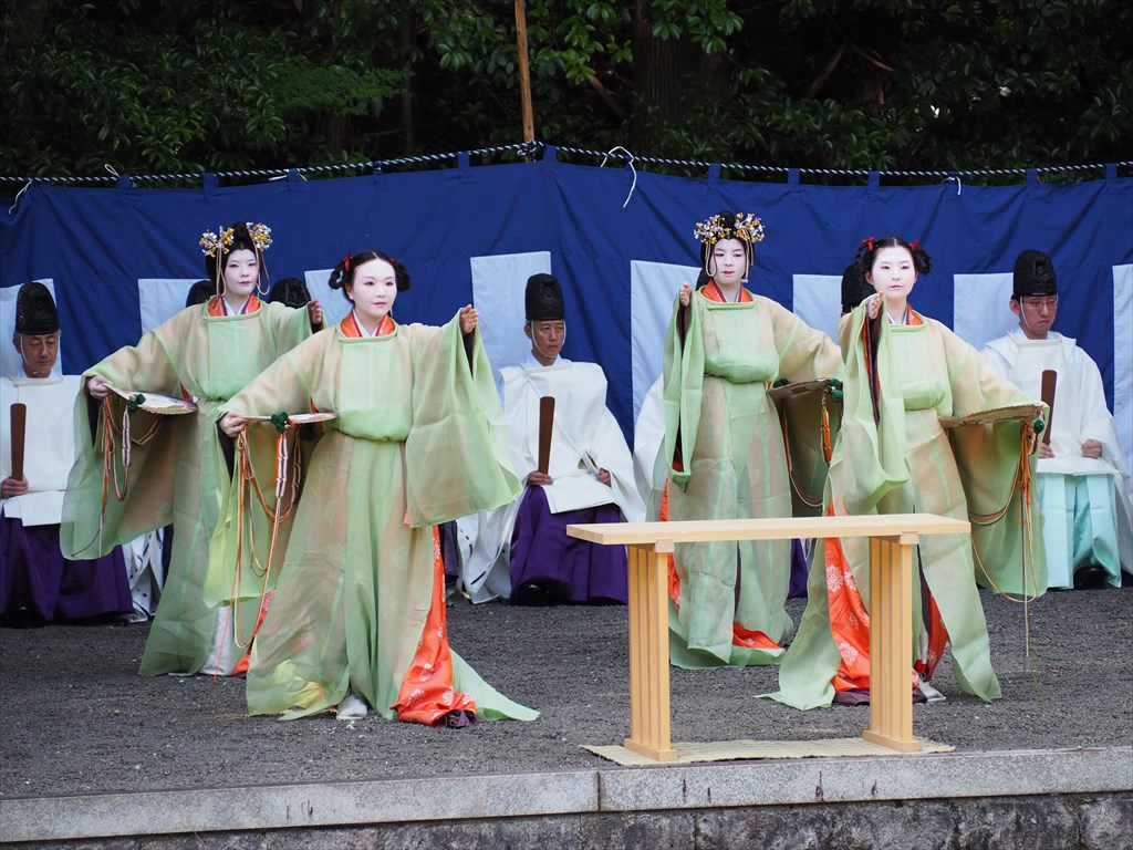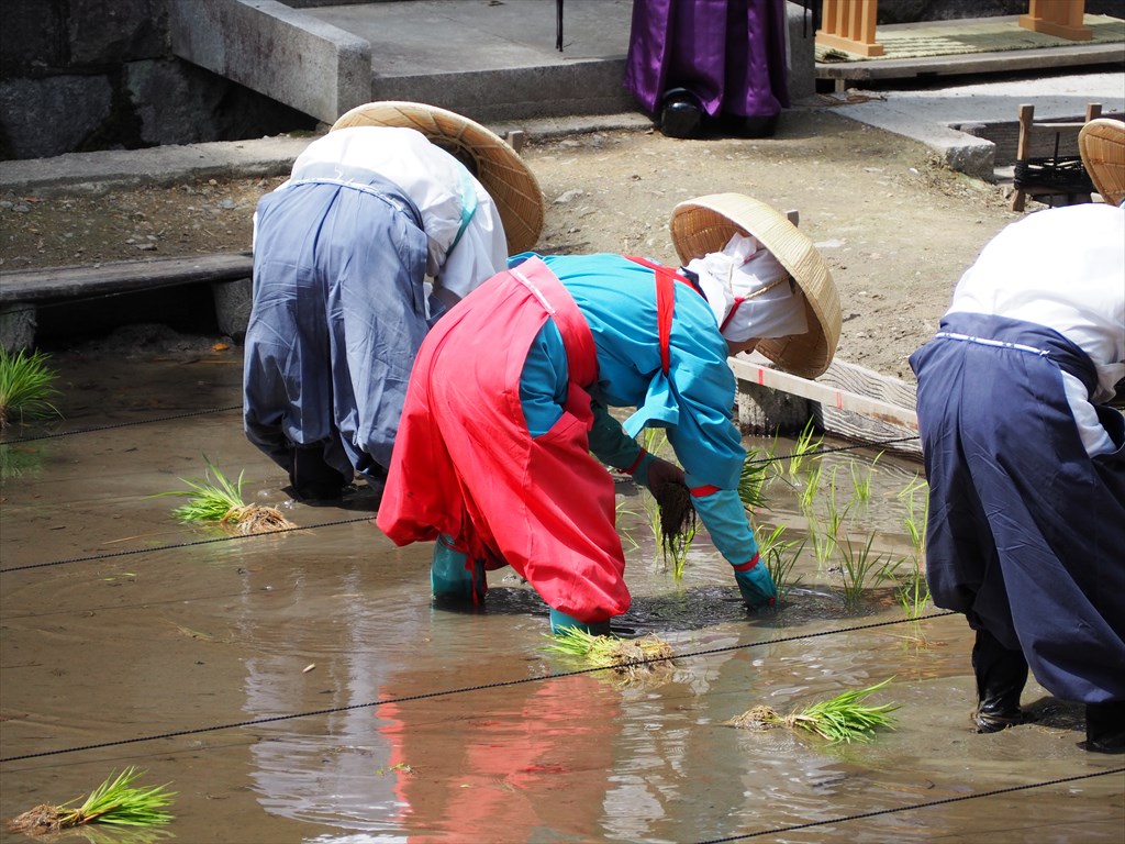 さて、6月10日の田植祭は、本殿での13時からの神事の後、神職・神楽女(かぐらめ)・早乙女(田植担当)らが14時頃に神田に移動してきます。まずは神田を祓い、御幣櫃に入れられた苗を神職が取り出して苗を植える代表者に渡し、さらに早乙女たちに手渡されると、神楽女が「御田舞(おたまい)」を舞う中で、一斉に苗が植えられていきます。