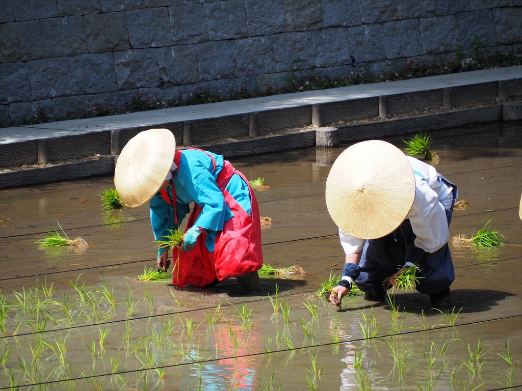 早乙女たちは手慣れたもので見る間に植え付けて行きます。神楽女の舞には詩も付いています。現地の看板によると「山城や稲荷の神の御田祭り いざもろともに往きて舞はばや」「八束穂の稲荷の御田におり立ちて 舞いつ奏でつ植うる早乙女」「稲荷山かげをひたせる斎田(いわいだ)に 八束(やつか)垂穂(たりほ)のあきの色みゆ」。との内容です。