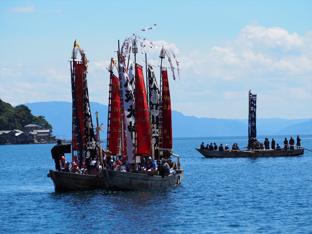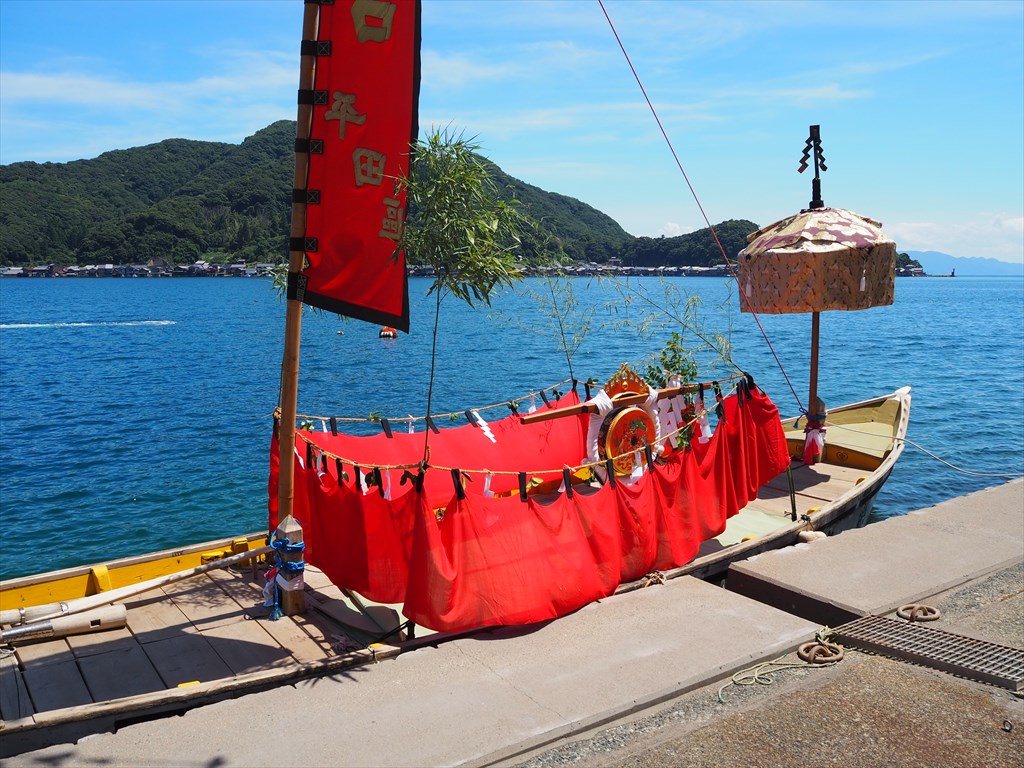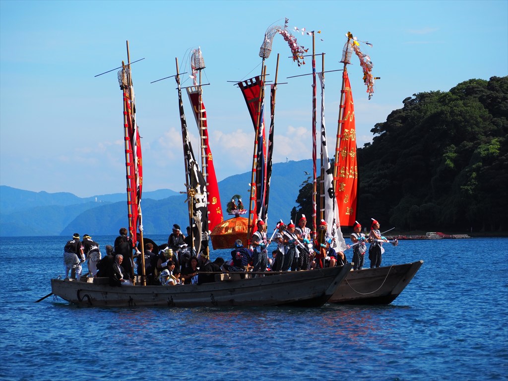 2024年は通例の「例祭」で、船屋台は出ず、亀島地区の神楽船と祭礼船、さらに平田地区の船が幟(のぼり)と傘を船の上に立てて伊根湾を行き来しました。伊根はやはり船で結ばれた集落だということがよくわかるお祭りでした。
