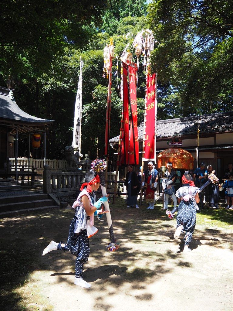 そして棒振りや太刀振りの奉納が行われました。時折動きが早くなったり、最後には「国家安康」の軍配を持った少年が現れて「ばんざーい」と声を出して終わる様子が面白いです。獅子舞も丁寧に奉納があり、もろもろで45分間ほどの奉納です。最後は神楽の屋台が勢いよく階段を下りていき、となりの正法寺で休憩に入っておられました。